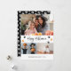 Cartão de Dia das Bruxas preto personalizado com três fotos com um título manuscrito na frente e um fundo preto com impressões na pata na parte de trás. Personalize facilmente este cartão de Dia das Bruxas preto com suas imagens, um nome de família e o ano. Esta placa de Halloween fofa pode ser transformada em qualquer cor usando a ferramenta de personalização.