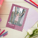 Lindo cartão de Dia das Familias com uma moldura de foto com flores fofas na frente em um fundo rosa sólido. O verso do cartão tem uma bela mensagem para sua família.