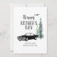 Um cartão de Dia dos Pais feliz com um design de carro antigo e pinheiros. Tem um espaço que pode ser personalizado com nomes e uma mensagem curta.