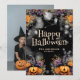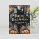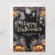 Cartão de Dia das Bruxas com fotografia personalizada, com lanternas-jack-o-o-vestindo chapéus pretos, flores roxas e laranja na frente e uma foto na parte de trás. Personalize facilmente este cartão de Dia das Bruxas com a sua foto e o nome da família. Esta bela carta de Halloween pode ser transformada em qualquer cor usando a ferramenta de personalização.