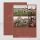 Ouro moderno e elegante "FELIZ", placa de colagem de fotos de Feriado. O cartão apresenta 5 fotos na frente com várias linhas para sua mensagem personalizada, nomes e ano atrás do cartão. As cores de fundo, mostradas em vermelho rústico, podem ser personalizadas.