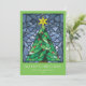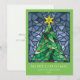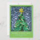 Estes cartões de saudação de Natal planos claros e coloridos de 5" x 7" apresentam um design de vitrine de cor aquosa feito à mão de uma árvore de Natal verde com uma estrela de ouro e ornamentos vermelhos enquadrados em tons de azul sobre um fundo verde de papagaio A saudação editável é "Feliz Natal", com marcadores para seu nome e ano. As costas têm a mensagem editável, "Desejando-lhe paz, amor e alegria nesta temporada de festas."