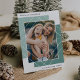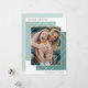 Um design de cartão com fotos de feriado moderno e atraente que apresenta uma foto vertical ou orientada para retratos, enquadrado por blocos de tons sobrepostos em verde-claro e sobreposto com formas de diamante branco para um visual geométrico de blocos coloridos. Personalize com seu cartões de natal personalizado (mostrado com "Feliz Natal"), seu nome de família e o ano.