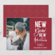 Novas Aventuras de Ano Novo, cartão com fotos de Férias. Apresenta a moderna tipografia branca-quic na burgundy rustica com a coordenação de um padrão geométrico de burgundy e ouro.