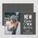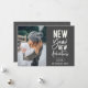 Novas Aventuras de Ano Novo, cartão com fotos de Férias. Apresenta uma tipografia branca-quic moderna em cinzas com cinza coordenadora e padrão geométrico de prata.