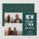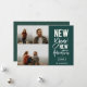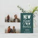 Novas Aventuras de Ano Novo, Cartão de Colagem de Fotos de Feriado 3 de Ano Novo. Apresenta uma tipografia branca-quic moderna em verde-caçador com a coordenação de padrões geométricos verdes e dourados.
