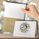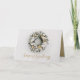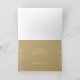 Os cartões de cartões de natal corporativos dobrados apresentam uma bela coroa de pinheiros trancada na neve, decorada com ornamentos de árvores de Natal brancas e douradas e flores na frente, e uma saudação personalizada e o nome da empresa em um fundo de ouro no dentro.