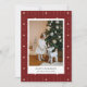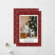 Cartão de férias com um fundo de papel de parede listrado vermelho e creme com uma foto da família emparelhada com um cartões de natal e seu nome e ano em uma fonte sans serif.