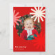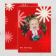 Este design de cartão de feriado bonito e divertido apresenta formas estilizadas de pompom/estrela/floco de neve brancas, cor-de-rosa e vermelha formando uma foto redonda e texto lendo "Seja Feliz" em branco sobre fundo vermelho profundo. A foto, o nome e a saudação podem ser facilmente personalizados para um toque pessoal. Também disponível como download de cartão de Natal digital.