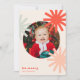 Este design de cartão de feriado fofo e divertido apresenta formas estilizadas de pompom/estrela/floco de neve azul-claro, rosa e vermelho formando uma foto redonda e texto lendo "Seja Feliz" em vermelho sobre um fundo de natas-claras. A foto, o nome e a saudação podem ser facilmente personalizados para um toque pessoal. Também disponível como download de cartão de Natal digital.