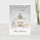 Cartões de natal para sua irmã e sua família. Este design apresenta uma ilustração aquarela da cena festiva da lareira com presentes. Ao fundo está uma cena de inverno.