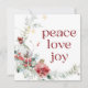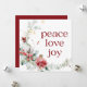 Um cartão vermelho branco de dois lados, com um arranjo de aquarela de verdes e bagas com alegria de amor pela paz na tipografia vermelha. O verso tem uma mensagem de feriado em uma fonte branca manuscrita que pode ser personalizada de acordo com suas necessidades. Assine com os nomes de sua família.