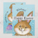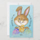 Um coelhinho do estilo cartoon vai animar seus filhos. Eles vão adorar este coelho pintado à mão sobre um fundo azul claro pontilhado. A pintura está em ambos os lados, a parte de trás mostra o coelho escondendo os ovos. Este é azul para o menino e há um rosa para a garota. Você também pode encontrar um envelope fofo e uma carta do coelho da Páscoa para as crianças em azul ou rosa na mesma coleção.