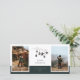 Tendy Rustic Scandinavian style cartão com fotos. Dois espaços verticais de fotos. Ramificação de aquarela adornada com pinecones e ornamentos decorativos de estrelas, design de tipografia quic com suporte de padrão de xadrez de tendência.