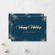 Cartões de férias azuis e dourados elegantes com flocos de neve e neve em um fundo azul. Um belo título feito à mão com efeito de folha dourada no centro. Personalize facilmente esses cartões de férias de floco de neve azuis e dourados com o nome da sua família e mensagem. Solicitações personalizadas são bem-vindas.