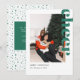 Este Cartões de foto de Natal verde e moderno apresenta a palavra "Cheer" em uma magnífica fonte com muitas estrelas dentro do texto. A parte traseira do cartão apresenta um plano de fundo verde estelar com espaço para inserir sua própria mensagem.