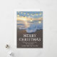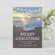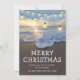 Cartões de natal de destino na praia com uma costa litorânea, um belo pôr do sol, luzes de cordas, o ditado "natal alegre", uma mensagem de feriado bonita, e seus nomes.
