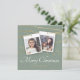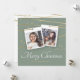 Um cartão de Cartões de natal de Natal muito na moda e moderno, com duas das suas próprias fotos na frente, pendurado em belos quadros brancos em linhas gravadas de ouro geométrico. Com boas estrelas brilhantes de ouro sobre um fundo verde.