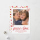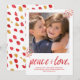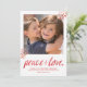 O design do Cartão de Férias Moderno para Paz e Amor apresenta um espaço reservado para fotos com pontos dourados e vermelhos espalhados no canto inferior esquerdo e superior direito e as palavras Paz e Amor em um script de pincel moderno. Este cartão de feriado coordena-se com os itens da Coleção de Feriados de Paz e Amor pela Oliva Superficial. COPYRIGHT ©2016, pelo The Spotted Olive, Todos os Direitos Reservados. Fotografia © Storytree Studios, Stanford, CA