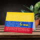 Cartão de saudação do Dia dos Namorados para o seu Amor com as palavras espanholas TE AMO - Eu te amo. Campo de estrelas sobre as cores da bandeira da Colômbia, América do Sul. Tricolor vermelho, azul e amarelo, Mensagem em espanhol com tradução para o inglês no interior.