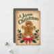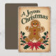 Este "Cartão de Férias de Natal Alegre" é um design festivo e entusiasmante que captura a essência do feriado. O cartão apresenta um biscoito alegre de gengibre com um rosto amigável, olhos vermelhos e bochechas rosadas, colocados contra um pano de fundo bege aconchegante. Folhas verdes e ocas com bagas vermelhas moldam o homem do pão-de-gengibre, enquanto um grande arco vermelho adiciona um toque de elegância. Ideal para enviar cartões de natal a familiares, amigos ou colegas. Esta carta é uma forma divertida e na moda para celebrar a magia do Natal e espalhar alegria a todos à vossa volta.