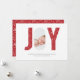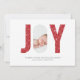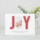 O J e o Y na palavra JOY é um padrão floral vermelho e o O exibe sua foto. A parte traseira da placa apresenta o mesmo padrão floral vermelho que a parte frontal.