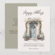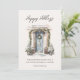 Imagem de cartão de férias plano com "Boas Festas" em letra cursiva moderna na frente, porta decorada com verde natalino em aquarela e espaço extra no verso para mensagem pessoal.