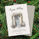 Cartão de férias plano com imagem de porta da frente decorada com verde natalino e "Férias Felizes" em letra moderna, com espaço extra no verso para mensagem pessoal.