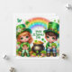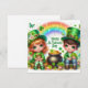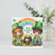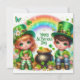 Cartão de Férias Feliz do Dia de São Patrício com um Menino e uma Menina Fofos, Potes de Ouro, Trevos, Flores, Animais e um Arco-íris
