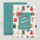 Coloque alguns pacotes de presentes no seu cartão de Natal! Parece engraçado, mas dê uma olhada. Nós achamos que os pequenos pacotes e caixas são divertidos e o padrão é muito bonito. Estas designs são de adorável origem de vintage. As aquarelas dos pacotes estão em matizes, mas alegres, matizes sazonais que mostram o feriado de inverno: vermelhos, verdes, amarelos, azuis e cremes em um fundo leve. Eles parecem um pouco retrógrados, especialmente por causa do arco cor-de-rosa e da proeminência do chalé. Todo o texto desta placa plana, que está em uma cor de creme correspondente, pode ser alterado. Certifique-se de editar os nomes de família e a data.