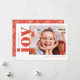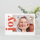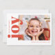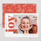 Este é um cartão de férias moderno, simples e brilhante, vermelho e branco, apresentando uma única foto minimalista combinada com “joy” em uma fonte serifada clássica e negrita.
