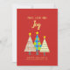 Mande uma alegria festiva com este cartão de Natal moderno, com um trio de árvores de Natal caprichosas num fundo vermelho ousado. A frente lê "Paz, Amor e Alegria" em uma fonte alegre, ao estilo dourado, com espaço para personalizar o nome da família e o ano abaixo. Uma escolha perfeita para as famílias que querem um na moda, mas sincero, para enviar votos calorosos nesta época de férias. Seja enviando mensagens para amigos, vizinhos ou colegas de trabalho, esse design único se destaca com cor e personalidade. Totalmente personalizável — mude o texto, as fontes e a mensagem de dentro para torná-la sua.