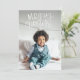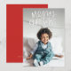 Uma mão branca escreveu "Feliz Natal" no topo da sua foto de feriado favorita. Personalize seu nome de família, foto e a cor sólida no verso. Perfeito para cartões de natal familiares.