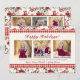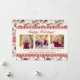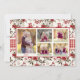 Um padrão floral de inverno tradicional clássico de poinsettias vermelhas, frutos e folhagens, com uma borda de gingham vermelha, compõe o fundo deste cartão que apresenta 3 fotos na frente, com espaço para a escolha da Saudação principal, além de uma segunda linha de saudação e uma linha para nomes, data ou citação favorita. O interior apresenta o mesmo padrão floral com espaço para 5 fotos e uma linha de texto ou data.