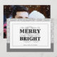 O design do cartão de Natal preto, cinza e branco da TeeLofts apresenta uma tipografia moderna e ousada 'Merry & Bright' sobreposta a um e comercial cinza claro como elementos principais do design. A borda externa é uma arte linear de vegetação de Natal em cinza e branco. É fácil adicionar os nomes da sua família na frente e uma foto no verso datado. #Natal #Férias #CartõesDeNatal