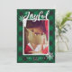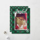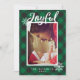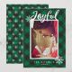 Este cartão de foto de férias apresenta sua foto de família favorita, A palavra "Alegre" em branco em uma tipografia manuscrita contra um fundo xadrez búfalo verde aconchegante acentuado com flocos de neve brancos. Personalize com o nome da sua família. O verso mostra um padrão de xadrez búfalo verde com flocos de neve brancos por toda parte.