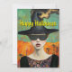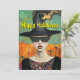 Um cartão de Halloween bruxo. A frente diz: Feliz Halloween. A parte de trás diz: É a Temporada Assustadora!
