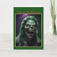 Este cartão de Halloween apresenta uma ilustração terrivelmente detalhada de um ghoul com pele esverdeada, olhos laranja brilhantes e presas ameaçadoras. O cabelo verde selvagem do ghoul aumenta a atmosfera sinistra, tornando-o uma escolha perfeita para aqueles que gostam do lado mais assustador do Halloween. A imagem é definida contra um fundo escuro e sombrio, com as palavras "Feliz Halloween" exibidas no topo em uma fonte clássica e negrita. O cartão é bordeado em verde, adicionando um toque final ao design assustador geral. Este cartão é ideal para enviar calafrios pela espinha de amigos e familiares que amam um bom susto no Halloween.