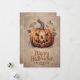 Feliz cartão de Dia das Bruxas com uma abóbora assustadora com folhas de outono em frente a uma grande teia. Personalize facilmente este cartão de Dia das Bruxas com seu nome e texto de família.