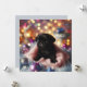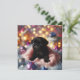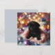 Cartão de Natal 5.25" x 5.25 plano com um adorável filhote de pug preto aninhado em um cobertor aconchegante, felizmente cercado por enfeites coloridos!