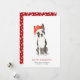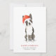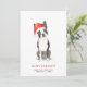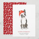Um cartão de Natal "Boston Terrier" bonito deseja feriados felizes personalizados com seus nomes, nome do cachorro e ano. Impressão da pata vermelha e branca festiva e fundo ósseo.