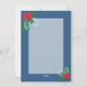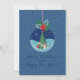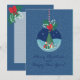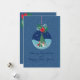 Cartão de férias azul festivo com ornamento de vidro com árvore de Natal e presentes, azevinho e laço vermelho. A página interna inclui uma área de escrita com linhas para a sua mensagem. Personalize nomes, saudações e ano. Perfeito para familiares, amigos, professores e colegas de trabalho.