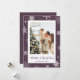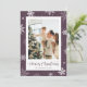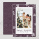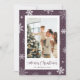 Cartão de Natal com flocos de neve roxos, com flocos de neve sobre fundo roxo de neve. Personalize facilmente este cartão fotográfico de Natal com a sua fotografia e o seu nome familiar.
