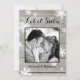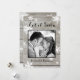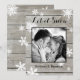 Flocos de neve brilhantes em um fundo de tábua de celeiro destacam sua foto neste cartão de Natal romântico.