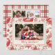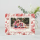 Este cartão de Natal plano com várias fotos apresenta um fundo clássico toile de ornamentos de Natal vermelhos para destacar uma única foto na frente e até 4 fotos no verso xadrez vermelho correspondente. Personalize suas fotos e sua mensagem, nomes e ano.