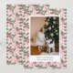 Cartão de Natal com um fundo de papel de parede rosa e verde pastel com uma foto de família combinada com uma saudação de Natal e seu nome e ano em uma fonte sem serifa.