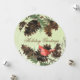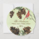 Um lindo cartão de Natal para enviar a todos os seus amigos e familiares, apresenta um cartão redondo com fundo de aquarela verde-claro, pinhas de pinheiro, galhos de árvore, um cardinal vermelho e texto personalizável que lê Felicitações Natalinas na frente, o mesmo fundo de aquarela verde, pinhas de pinheiro, cardinal vermelho e galhos com uma área personalizável para adicionar o nome da sua família, primeiros nomes e ano atual no verso.