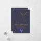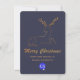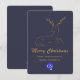 Cartão de saudação de Natal elegante, de cor azul, ardente e escura, com um veado estilizado de cor dourada, na metade superior do cartão. Dourado aspecto brilhante texto gráfico lendo Feliz Natal, decora a metade inferior do texto personalizado do tom da placa pronto para personalizar com o nome de sua empresa e uma área de logotipo está pronta para ser substituída pelo logotipo de sua empresa.
