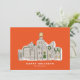 Este cartão de feriado corporativo, de formato branco, apresenta uma linha do horizonte de cidade desenhada à mão, decorada para a época de Natal. Ilustração e design por Annie Montgomery Design.