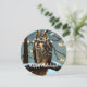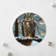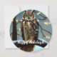 Lindo e exclusivo cartão de Natal redondo apresenta arte digital gerada por IA com design de Natal de uma coruja grande empoleirada em um galho coberto de neve com luzes brancas nas árvores e um fundo de céu estrelado. O cumprimento "Feliz Natal" pode ser personalizado para um de sua escolha